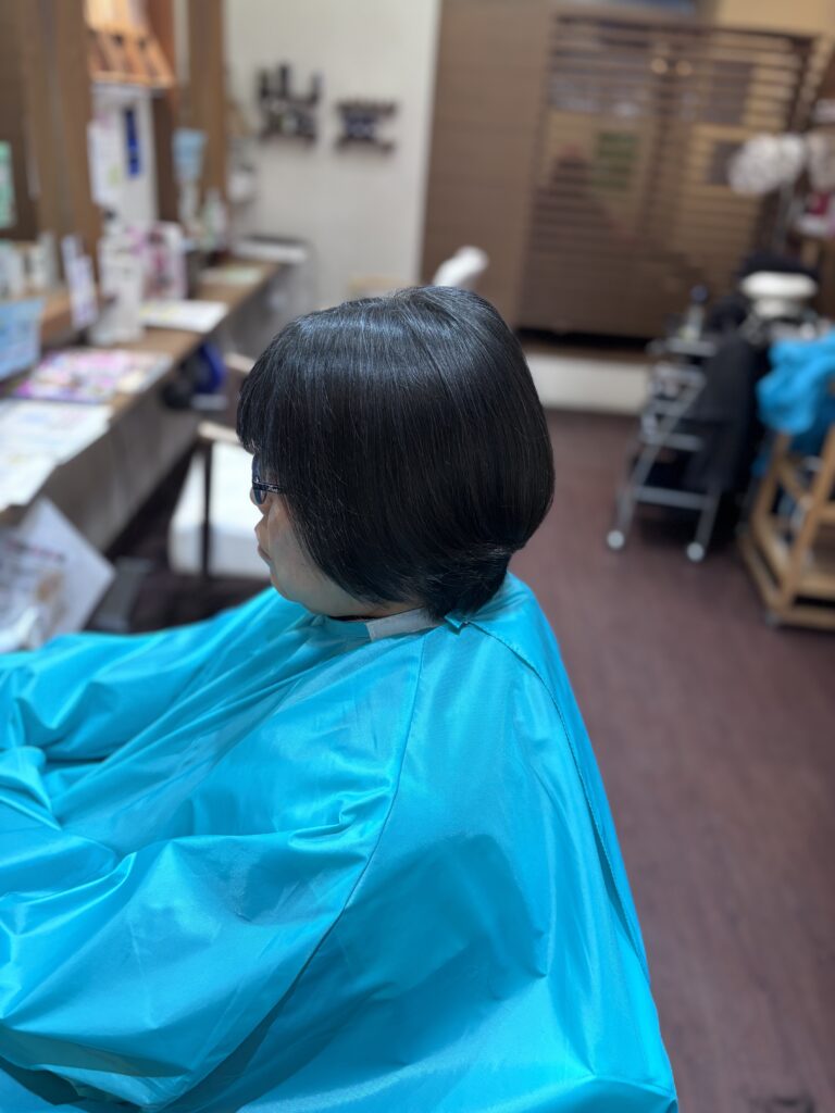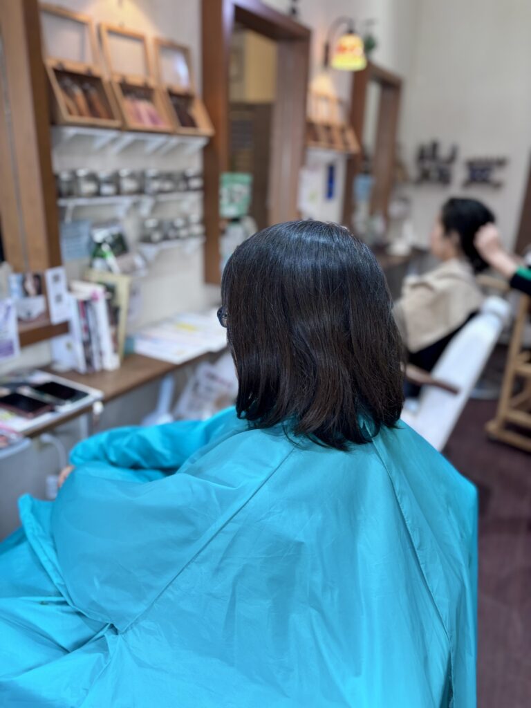 ハンドブローだけで仕上げましたが、髪にツヤが出て広がりもおさえられ、トップの分け目も目立たなくペタンとしたシルエットも改善されました(^^)