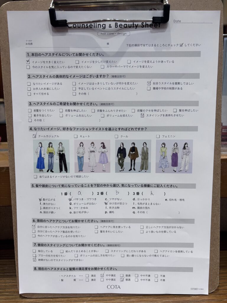 このようなカウンセリングシートにチェックを入れていただくことによって貴女の理想が見えてきます!